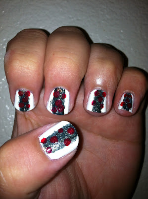 Now, this mani was really hard to do (for me) even though it was originally going to be easy, at least I thought so. After starting this many I managed to mess up 3 nails within a few minutes. I spilled my Revlon Red nail polish everywhere, and then my camera started acting up. It pissed me off so bad.... To the point where I almost quit completely.